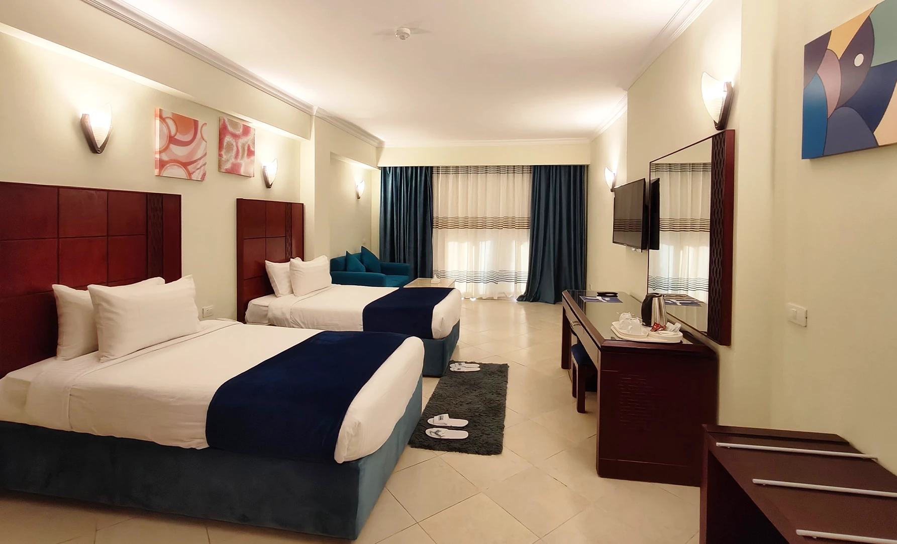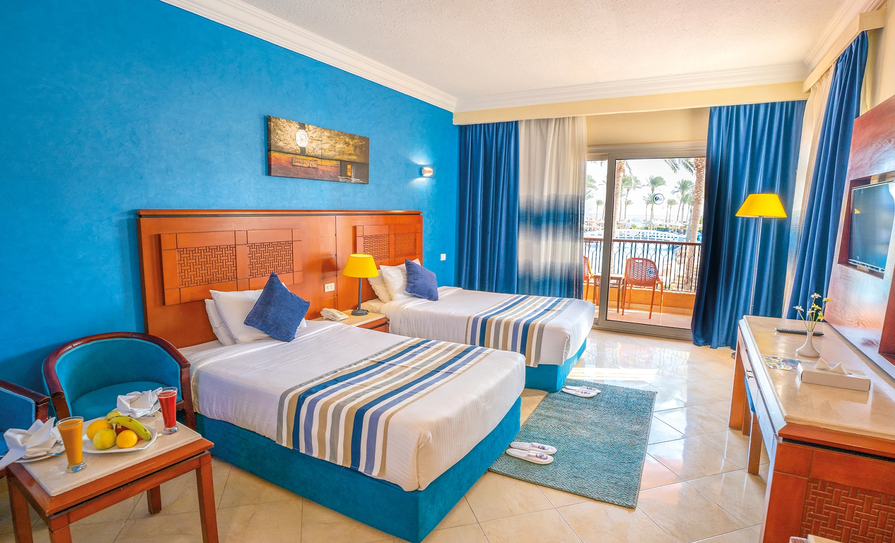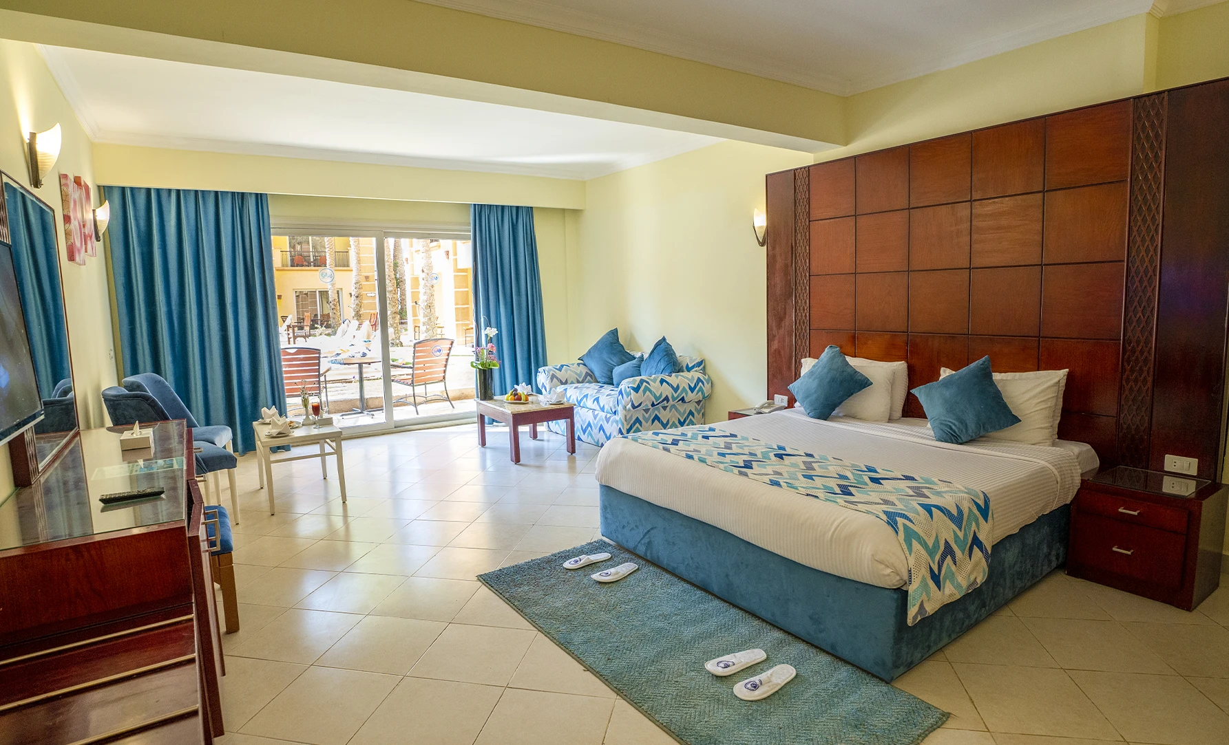 470 camere suddivise in varie tipologie. Le Standard (35 m², occupazione massima 4 persone) sono dotate di servizi privati con asciugacapelli, TV satellitare, minifrigo, cassetta di sicurezza, aria condizionata, connessione Wi-Fi gratuita e balcone o veranda. NB: In caso di 4 occupanti (2 adulti + 2 bambini o 3 adulti + 1 bambino) in camera base, lo standard prevede un totale di 3 letti (matrimoniale + letto singolo aggiunto, o in alternativa 3 letti singoli). Per un maggiore comfort, sono disponibili con supplemento camere family (60-70 m², occupazione massima 5 persone) formate da due ambienti separati. In alternativa sono a disposizione, sempre con supplemento, camere vista mare, della stessa metratura e arredamento delle standard, ma con vista differente.
